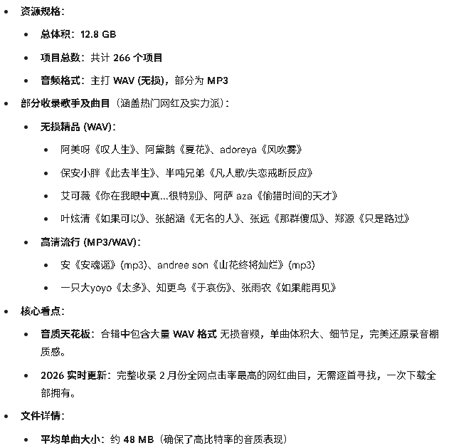 【2026年2月新歌】热门网红流行新歌大合辑:12.8GB 顶级音质,收录 266 首必听单曲(WAV 无损/秒存