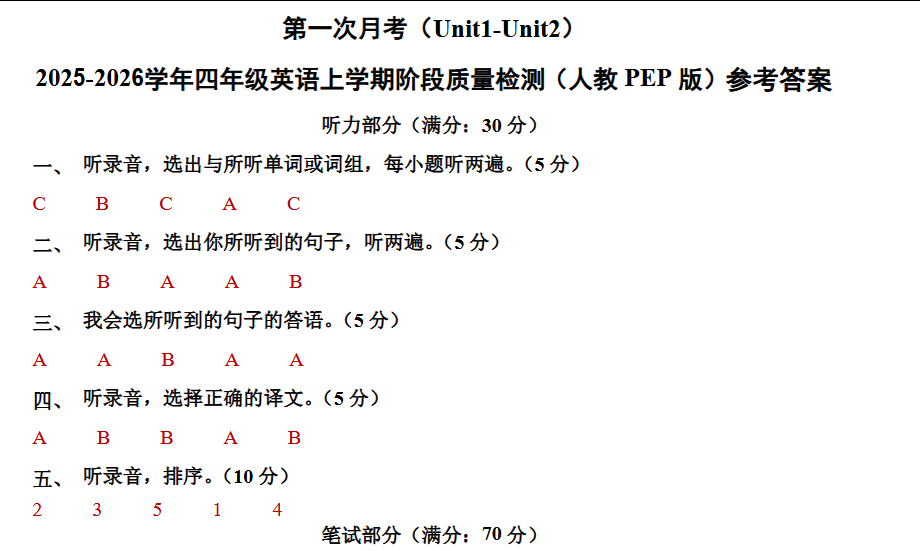 人教版英语月考卷合集[玫瑰] 人教版英语3-6年级第一次月考卷(第一 二套)