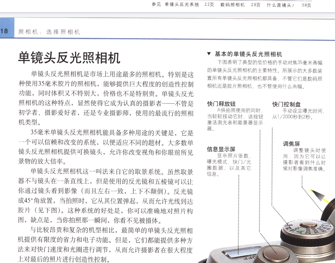 单镜头反光照相机是市场上用途最多的照相机。特别是这种使用35毫米胶片的照相机,能够提供巨大程度的创造性控制功能,同时体积又不特别大,价格也不是特别贵。单镜头反光照相机的这种特点,显然使得它成为认真的摄影者--不管是初学者、摄影爱好者,还是专业摄影师,使用的最流行的照相机类型。